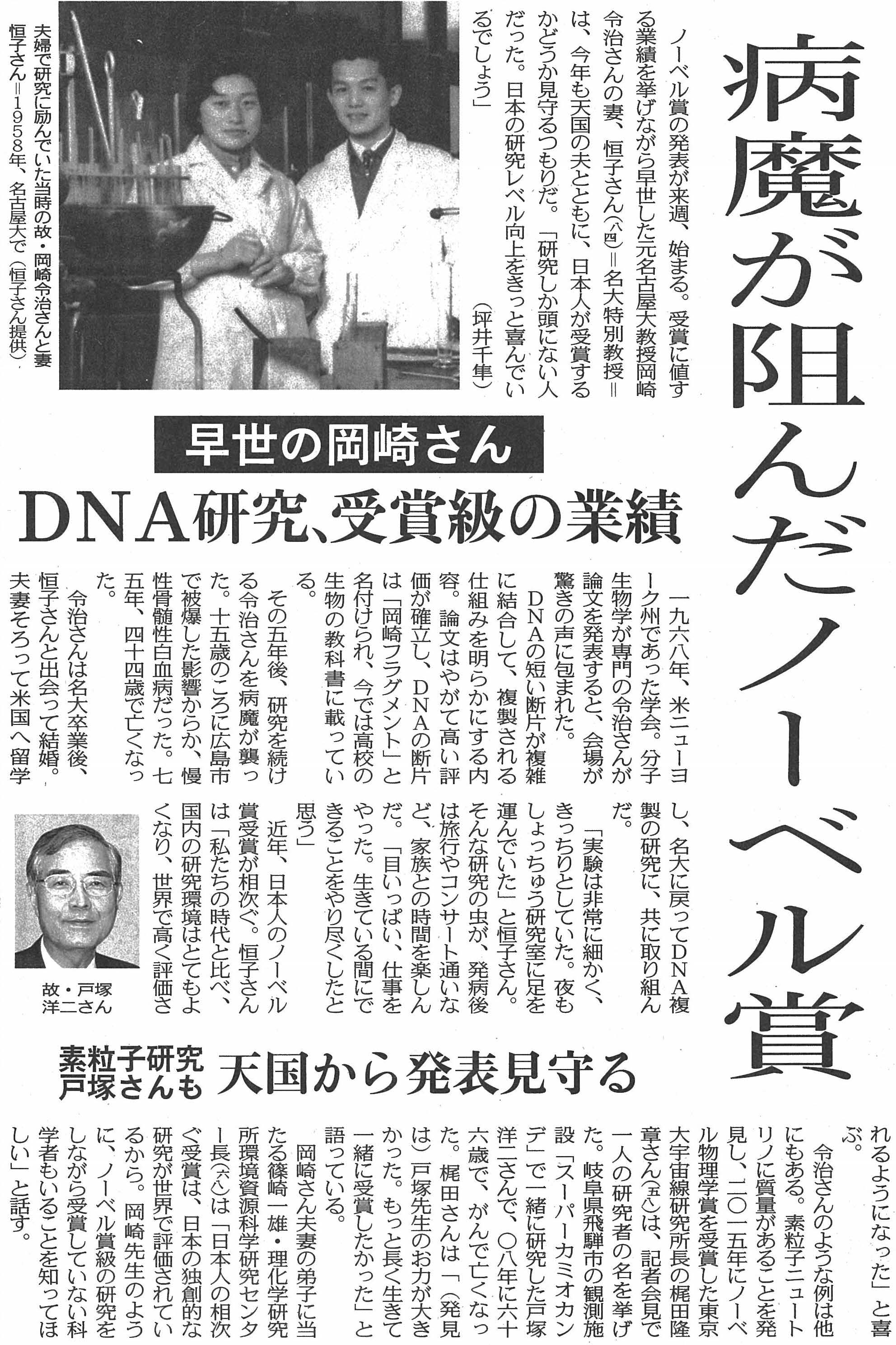 今年度のノーベル賞ウィークに関連して、当専攻ご出身の岡崎令治先生、恒子先生が、9月30日付の中日新聞(夕刊)で紹介されました。ぜひご一読ください。