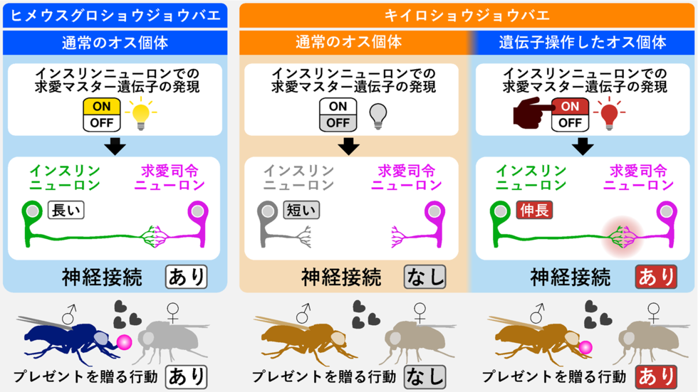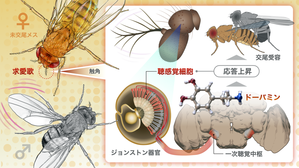 研究内容について私たちは、「ショウジョウバエ」 と 「蚊」 を使って、求愛コミュニケーションを成立させる脳のしくみを調べています。最近の研究発表■ プロポーズの流儀を決める遺伝子と脳のスイッチTanaka*† , Hara †, Sato, Kohatsu, Murakami, Higuchi, Awasaki, Kondo, Toyoda, Kamikouchi , Yamamoto* (2025). ![]() ■ メスの求愛歌受け入れをドーパミンが促進する Yamakoshi, Horigome, Yamamoto, Iwanami, Iwami, Tanaka, Ishikawa, & Kamikouchi (2025) ![]() ■ 蚊の"聴覚"を操る鍵は、神経伝達物質と細胞内シグナル Xu, Loh, Lee, Chen, Loh, Ohashi, Eberl, Andrés, Su#, Kamikouchi# (2025) ![]() ■ 蚊の脳が音に反応する様子を世界で初めて可視化 Ohashi, Xu, Shigaki, Nakamura, Lee, Loh, Mishiro-Sato, Eberl, Su* & Kamikouchi* (2025) ![]() ■ 蚊の異種交配を抑制する聴覚特性の種間差 Loh#, Xu#, Lee, Ohashi, Zhang, Eberl, Su* & Kamikouchi* (2024) ![]() ■ ハエのリズム聴き分け能力を上げる神経機構 Imoto, Ishikawa, Aso, Funke, Tanaka & Kamikouchi (2024) ![]() ■ 2種類のハエの求愛歌の好みの進化を支える神経機構 Ohashi, Ishikawa, Awasaki, Su, Yoneyama, Morimoto & Kamikouchi (2023) ![]() ■ 交尾を継続するためのメカニズム Yamanouchi, Tanaka & Kamikouchi (2023) ![]() ■ 蚊の「耳」を操る物質を発見 Xu, Loh et al., (2022) ![]() ■ 2種類のハエが示す、群れ形成のダイナミクスの違い Shirasaki, Tanaka et al., (2022) ![]() ■ 音のリズムを聞き分けるメカニズムの発見 Yamada et al., (2018)