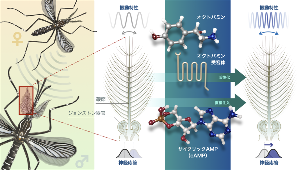 ■ 蚊の配偶行動を制御する神経機構の解明と応用![]() 蚊は吸血することで感染症を媒介し、毎年数十万人規模で人を死に至らしめます。蚊の吸血は、交尾後のメスが産卵のための栄養源を得る行動です。よって、蚊の被害を防ぐ方策の一つとして、配偶行動への介入が考えられます。そこで私たちは、日本を含むアジア地域においてデング熱やジカ熱などを媒介するヒトスジシマカや、熱帯地方でそれらの感染症を媒介するネッタイシマカなどの蚊を対象にして、その配偶行動を成立させる神経基盤の解明に挑んでいます。特に、配偶行動に重要な役割を果たすと予想される聴覚系に着目して、その機能や特性を行動や神経細胞のレベルで解明することを目指しています。蚊の配偶行動を聴覚を中心に据えて理解することで、新たな蚊の繁殖制御法の開発に繋がる可能性があります。 ■ HFSP2021 採択課題: 蚊の聴覚コミュニケーションの解読 Decoding acoustic communication in mosquitoes : From distortion products to vector control