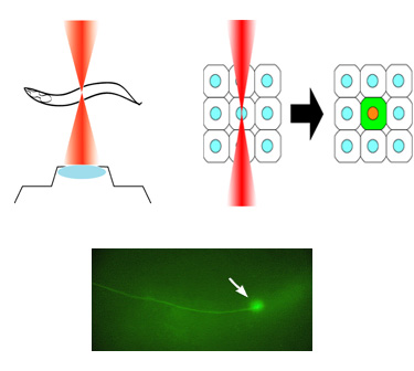 | We have been also interested in the development of research tools. The Infrared-laser-evoked gene operation (IR-LEGO) system, is designed to induce the heat shock response with high efficiency without causing cell damage, thereby effectively driving expression of a transgene under the control of a heat shock promoter. We have succeeded in applying IR-LEGO to living C. elegans (in collaboration with Shunsuke Yuba at AIST, Kamei et al., 2009). This method, enabling us to induce expression of desired genes in targeted cells, would serve as a useful tool for studying not only C. elegans but also many other multicellular organisms in vivo. |